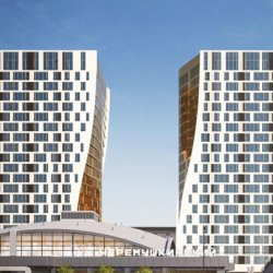 Две 21-этажные башни со сложной геометрией объединит высокий шестиметровый стилобат. Фасадные конструкции типовых этажей представляют собой навесной вентилируемый фасад. Часть стен между оконными проемами облицуют керамогранитом с рисунком, напоминающим текстуру светлого камня, другую часть оформят с градиентным паттерном. На торцах установят стемалитные панели. Внешние блоки кондиционеров скроют в интегрированных нишах, не нарушая архитектурную эстетику.