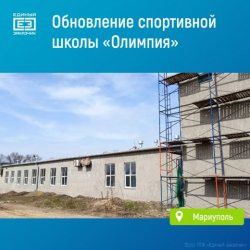 В Мариуполе продолжается восстановление спортивной школы «Олимпия». Строители уже устранили все конструктивные повреждения здания, обновили кровлю и окна, утеплили фасад и проложили новые инженерные коммуникации.