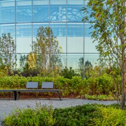Озеленение подобрано так, чтобы парк оставался живым и красивым даже в условиях ветров, относительно небольшого слоя почвы на кровле стилобата и отраженного от стекол двух офисных башен солнечного света.