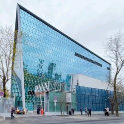 Уникальное восьмиэтажное (с двумя подземными уровнями) здание технопарка площадью более 76 тысяч квадратных метров напоминает трапециевидный кристалл с нависающими над основанием гранями. Его выразительный облик подчеркивают сплошное витражное остекление фасада и ромбовидные эркерные соты, расположенные в шахматном порядке. Внутри обустроены атриум со светопрозрачным плафоном и многосветные пространства. Подземный паркинг рассчитан на 285 машино-мест.