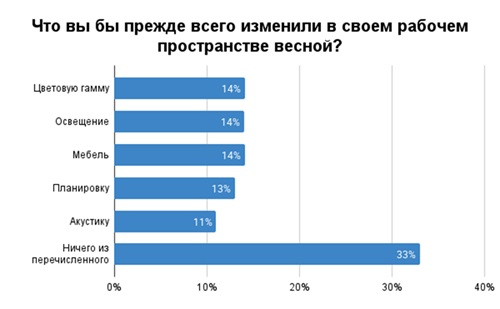 Так, 33% участников опроса не смогли выбрать, что они хотели бы изменить в их рабочем пространстве весной. По 14% респондентов мечтают о другой цветовой гамме в офисе, более удобной мебели и комфортном освещении пространства. 11% опрошенных мешает плохая акустика в офисе, а 13% сотрудников не устраивает планировка.